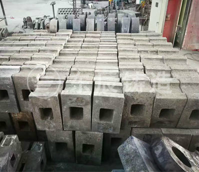制砂机锤头又称高铬制砂机锤块,选用高铬合金材料一次浇铸而成,采用多种合金匹配,钼、钒、镍、铌、钨、钛、稀土等贵重金属元素搭载,经淬火液水韧处理后,硬度大幅提高,达62HRC-65HRC,使用寿命比锻造锤头或高锰钢锤头要长!与高锰钢锤头相比,具有高硬度、高耐磨、出料细的特性,高铬铸铁锤头中的高硬度马氏体基体,强有力地支承碳化物颗粒,避免工作过程中碳化物从磨损表面脱落,保证了材料的高抗磨性。